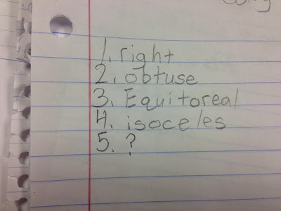 We are in a heavy geometry section in my 6th grade math class. A recent lesson focused on 6 types of triangles. Those classified by angle: acute, right, and obtuse. And those classified by length of sides: equilateral, isosceles, and scalene.